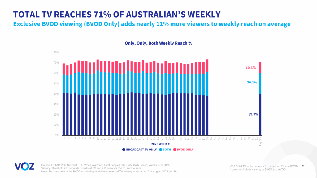 Broadcast TV or BVOD reached 71% of Australians each week, with exclusive BVOD viewing adding nearly 11% more viewers.