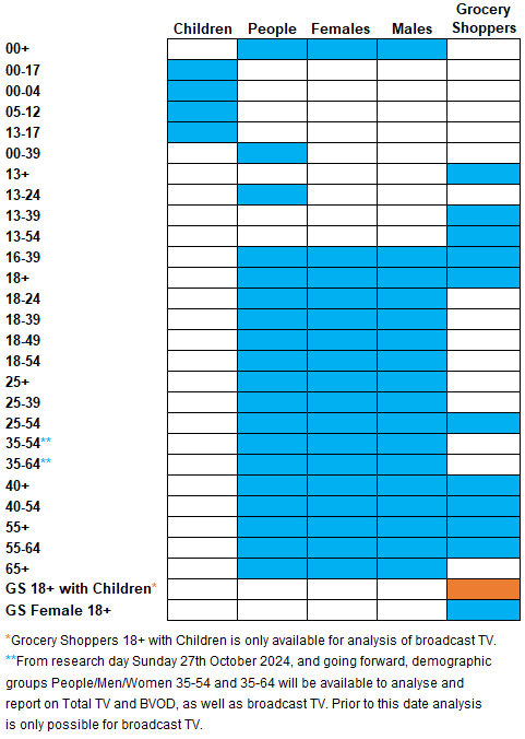 The removal of the GB demographics is in line with the introduction of Grocery Shopper (GS) demographics. The GS demographic was introduced in 2017 to reflect the change in the grocery shopping roles within the household and includes the main grocery buyers as well as alternate grocery shoppers within the home.